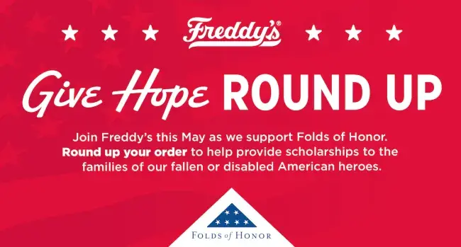In addition to making an extra effort to show appreciation and recognition during this month, it’s important to continue this support throughout the year. At Freddy’s, one way in which we do this is by partnering with Folds of Honor. Since 2007, Folds of Honor has been providing scholarships to spouses and children of America’s fallen or disabled service members. Recently, this organization has also expanded its offerings to include families of America’s first responders. Rated a four-star charity at Charity Navigator and holding the Guidestar Platinum Seal, Folds of Honor was founded by Lt Col Dan Rooney. To date, this non-profit has provided over 60,000 scholarships. Freddy’s began working with Folds of Honor in 2022, with a month-long fundraiser program available in Freddy’s franchises across the country.